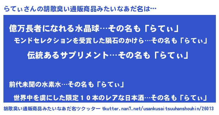 | 男性向けラノベタイトル風あだ名 | 『らてぃの嫁は女の子じゃないと思った?』 |