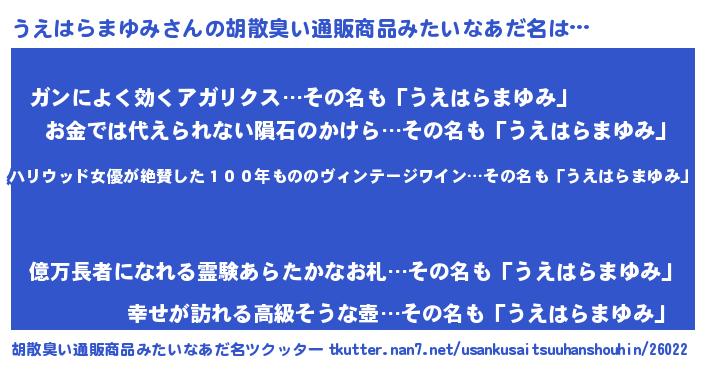 | 意味不明あだ名 | 『住所不定無職うえはらまゆみ(2歳)』 |
