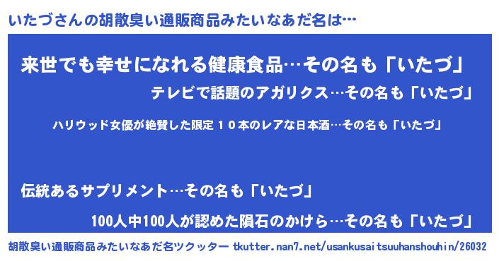 | 意味不明あだ名 | 『住所不定無職いたづ(68歳)』『自称いたづ』 |