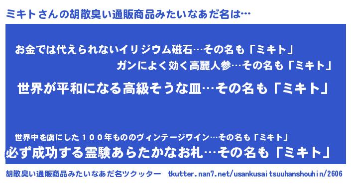 | 意味不明あだ名 | 『ミキトフォーエバー』『ペロリンミキト』 |