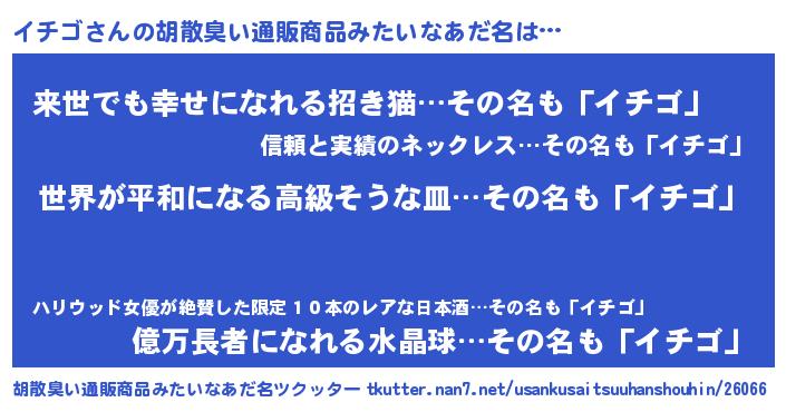 | ヘコむあだ名 | 『なまこ酢』『イチゴ(爆)』『イチお』 |
