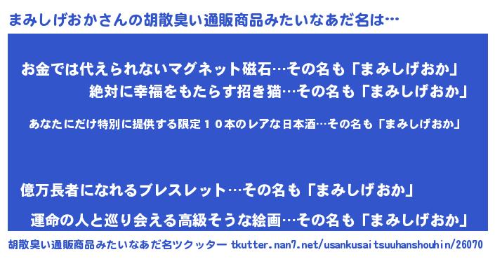 | 意味不明あだ名 | 『住所不定無職まみしげおか(39歳)』 |