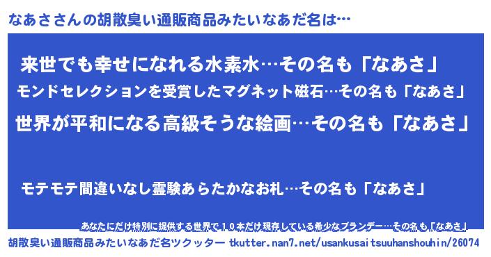 | 男性向けラノベタイトル風あだ名 | 『転生したらなあさだった件』 |