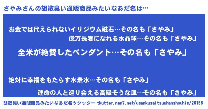 | 男性向けラノベタイトル風あだ名 | 『さやみの嫁は女の子じゃないと思った?』 |