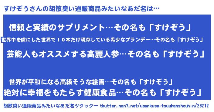 | 男性向けラノベタイトル風あだ名 | 『Re:すけぞうから始める異世界生活』 |