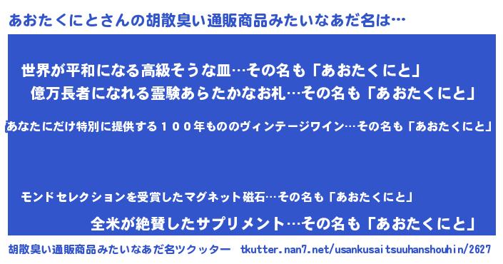 | 意味不明あだ名 | 『住所不定無職あおたくにと(5歳)』 |