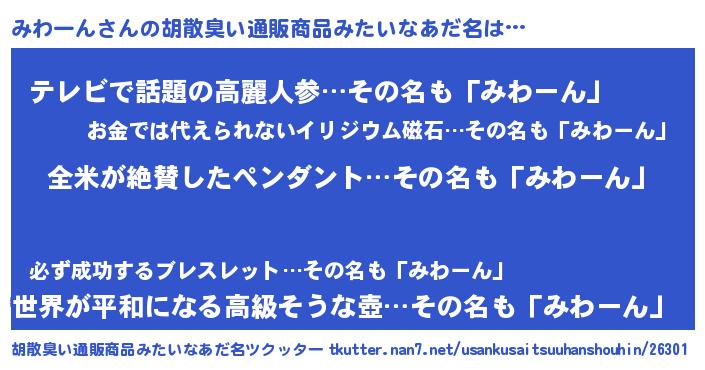 | 男性向けラノベタイトル風あだ名 | 『みわーんの嫁は女の子じゃないと思った?』 |