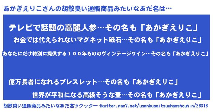 | 男性向けラノベタイトル風あだ名 | 『この素晴らしい世界にあかぎえりこを!』 |