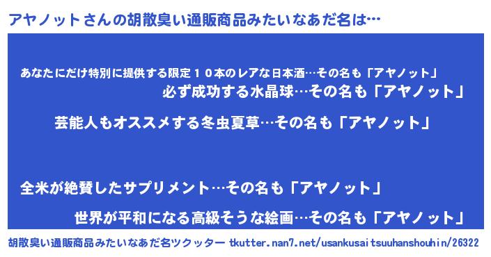 | 意味不明あだ名 | 『自称アヤノット』『ペロリンアヤノット』 |