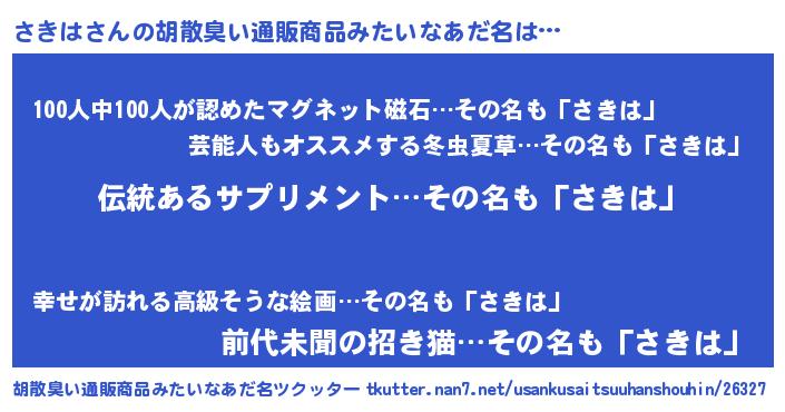| 意味不明あだ名 | 『なめこ科さきは属』『永久保存さきは』 |