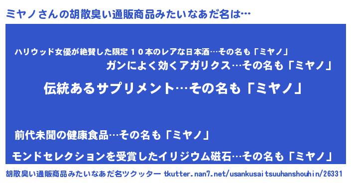 | 男性向けラノベタイトル風あだ名 | 『ダンジョンにミヤノを求めるのは間違っているだろうか』 |