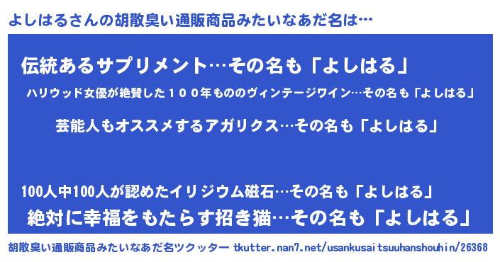 | ヘコむあだ名 | 『よしっ子』『よしはる(笑)』 |
