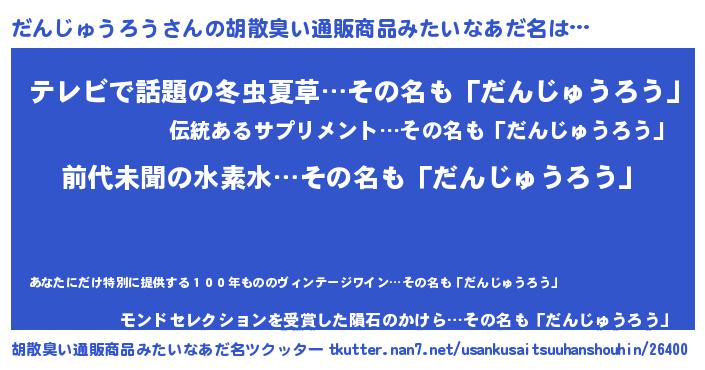 | 男性向けラノベタイトル風あだ名 | 『だんじゅうろうに滅ぼされるだけの簡単なお仕事です』 |