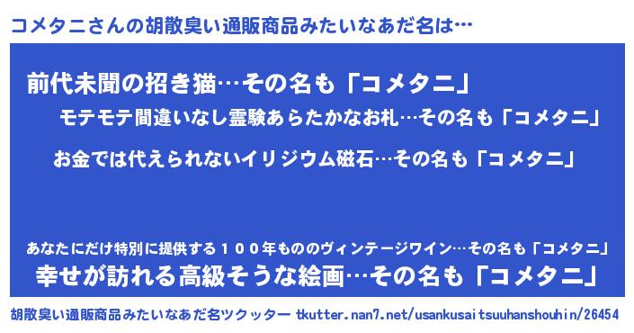 | 女子向けラノベタイトル風あだ名 | 『コメタニ恋絵巻』『コメタニ伯爵の花嫁』 |