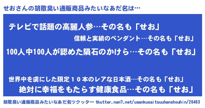 | ヘコむあだ名 | 『せお(苦笑)』『せおっぺ』 |