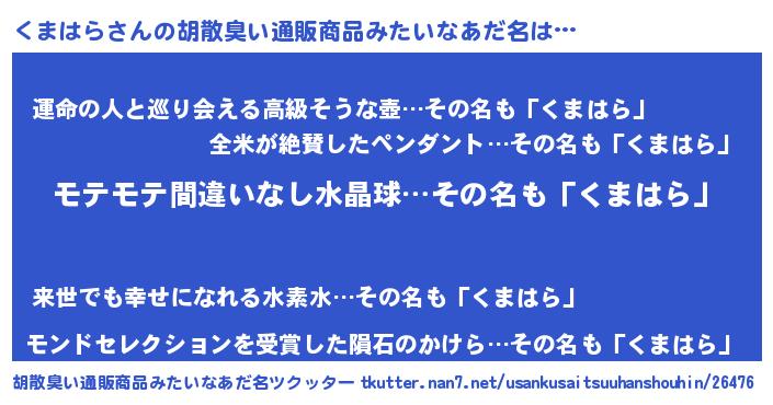 | ヒーロー風カッコイイあだ名 | 『スーパークマハラ』『幻影騎士クマ』 |