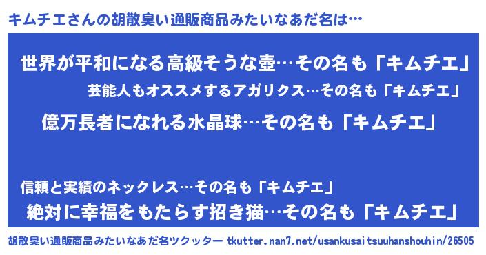 | 男性向けラノベタイトル風あだ名 | 『キムチエに滅ぼされるだけの簡単なお仕事です』 |
