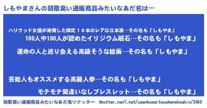 | 男性向けラノベタイトル風あだ名 | 『うちのしもやまが世界を掌握している!』 |