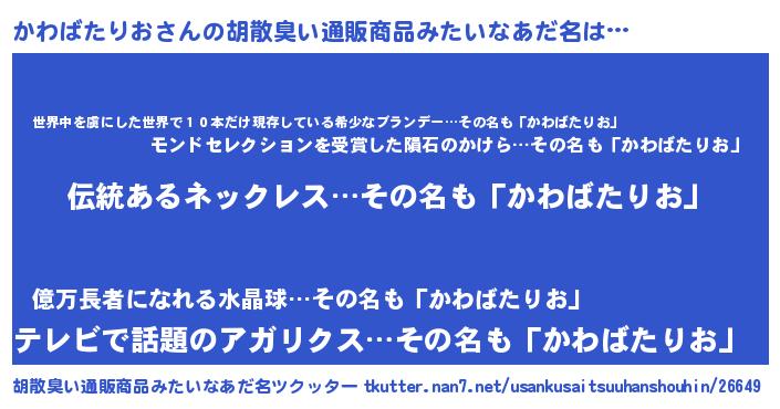 | 意味不明あだ名 | 『とにかく怪しいかわばたりお』 |