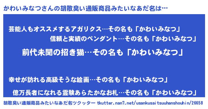 | ヒーロー風カッコイイあだ名 | 『ネオカワイミナツ』『魔戒騎士カワ』 |