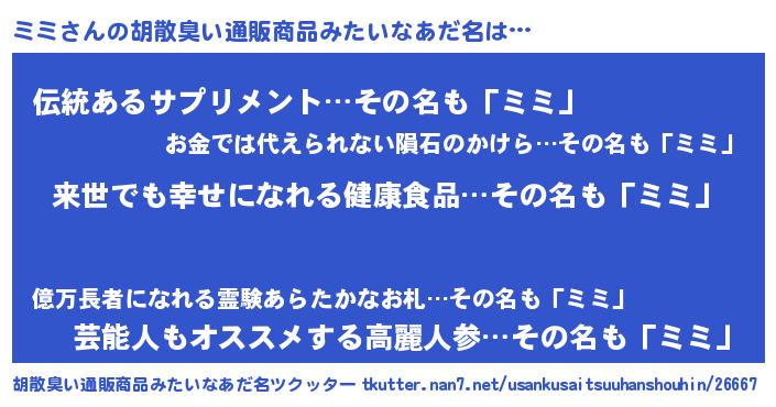| 男性向けラノベタイトル風あだ名 | 『ミミという概念が存在しない退屈な世界 』 |