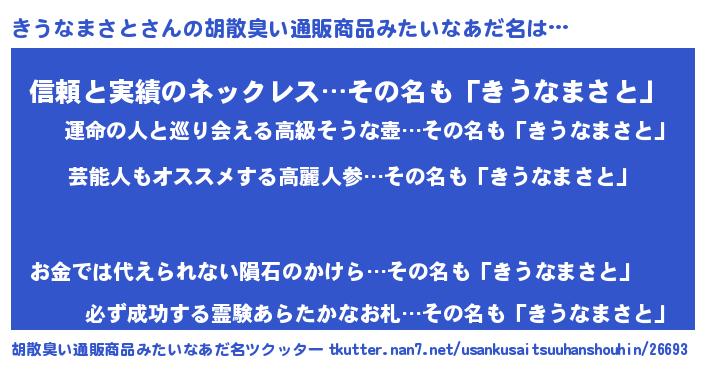 | 男性向けラノベタイトル風あだ名 | 『Re:きうなまさとから始める異世界生活』 |