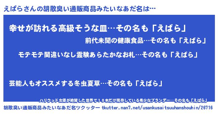 | 男性向けラノベタイトル風あだ名 | 『えばらの憂鬱』『魔弾の王とえばら』 |