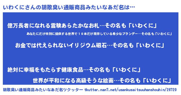 | 男性向けラノベタイトル風あだ名 | 『おまえをオタクにしてやるから、俺をいわくににしてくれ! 』 |