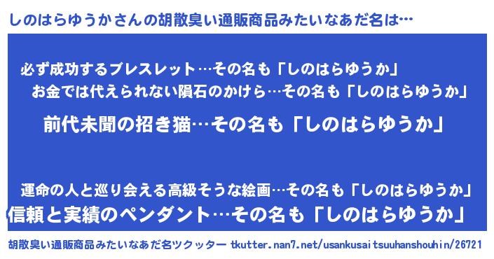 | 男性向けラノベタイトル風あだ名 | 『しのはらゆうか~年齢イコール彼女いない歴の魔法使い~』 |