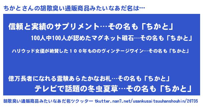 | 男性向けラノベタイトル風あだ名 | 『魔弾の王とちかと』『チカトスレイヤー』 |