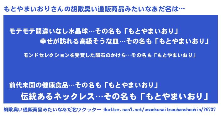 | 男性向けラノベタイトル風あだ名 | 『うちのもとやまいおりが世界を掌握している!』 |