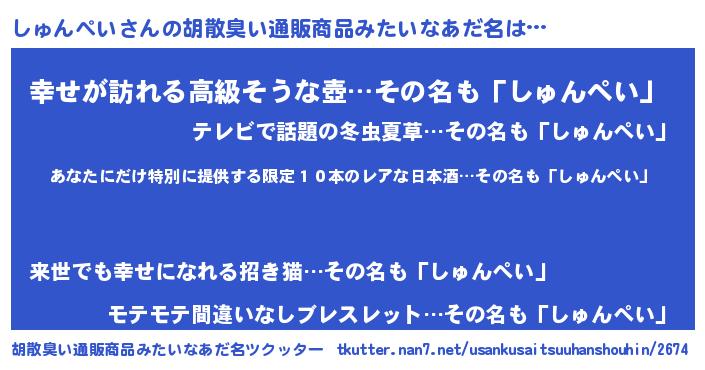 | 意味不明あだ名 | 『住所不定無職しゅんぺい(56歳)』 |
