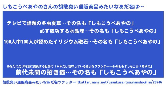 | ヘコむあだ名 | 『しもこうべあやの(爆)』『しもっふぃ~』 |