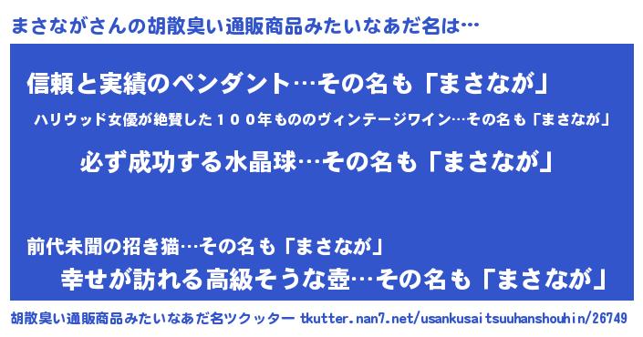 | 男性向けラノベタイトル風あだ名 | 『マサナガスレイヤー』『まさながの憂鬱』 |