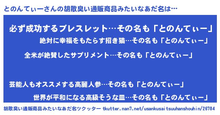 | 男性向けラノベタイトル風あだ名 | 『とのんてぃーの嫁は女の子じゃないと思った?』 |
