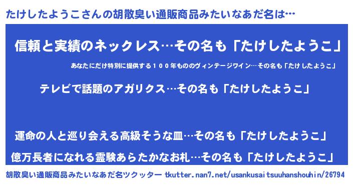 | ポケモン風あだ名 | 『タケセウス』『ヒタケシタヨウコ』 |