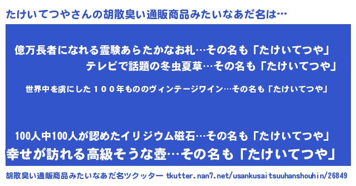 | 意味不明あだ名 | 『住所不定無職たけいてつや(6歳)』 |