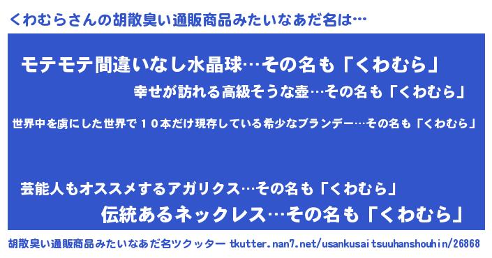| 意味不明あだ名 | 『住所不定無職くわむら(98歳)』 |