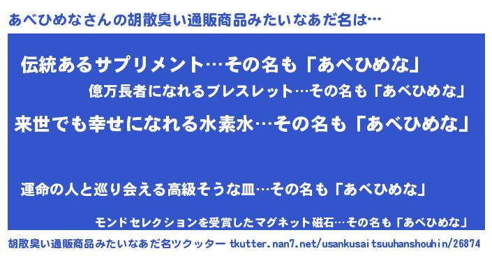 | 肩書あだ名 | 『あべひめな上級大将』『あべひめな先生』 |