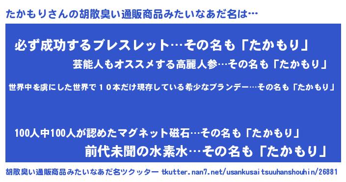 | 意味不明あだ名 | 『住所不定無職たかもり(86歳)』 |