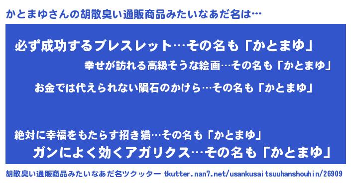 | 男性向けラノベタイトル風あだ名 | 『転生したらかとまゆだった件』 |