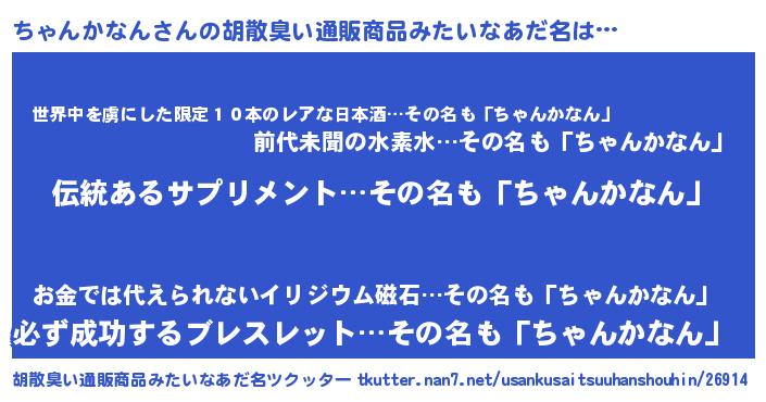 | 男性向けラノベタイトル風あだ名 | 『転生したらちゃんかなんだった件』 |