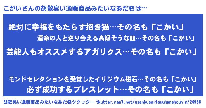 | 意味不明あだ名 | 『自称こかい』『永久保存こかい』 |