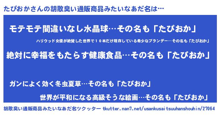 | 女子向けラノベタイトル風あだ名 | 『異世界で失敗しない100のたぴおか』 |