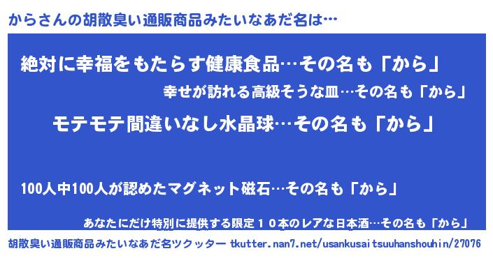 | ヘコむあだ名 | 『からにゅー』『から(爆)』『からを』 |