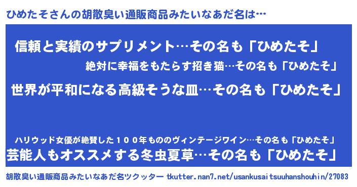 | 女子向けラノベタイトル風あだ名 | 『ひめたそ伯爵の花嫁』『闇のひめたそ』 |