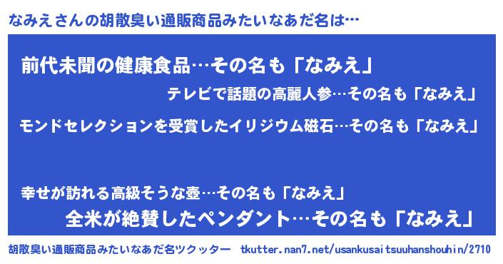 | 女子向けラノベタイトル風あだ名 | 『死神なみえの再婚』『なみえ様がみてる』 |