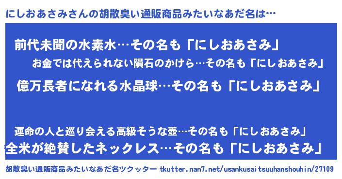 | ヘコむあだ名 | 『にしにゅー』『にしおあさみ(遠い目)』 |