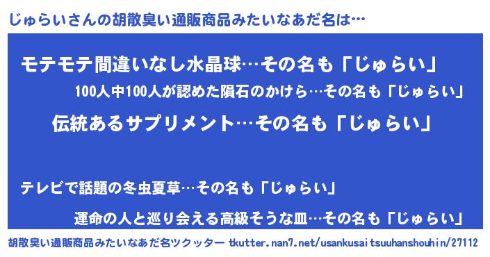 | ヘコむあだ名 | 『じゅ太郎』『じゅもー』『レバニラ』 |