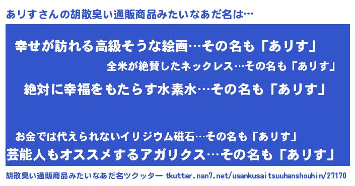 | 意味不明あだ名 | 『永久保存あリす』『あリすフォーエバー』 |